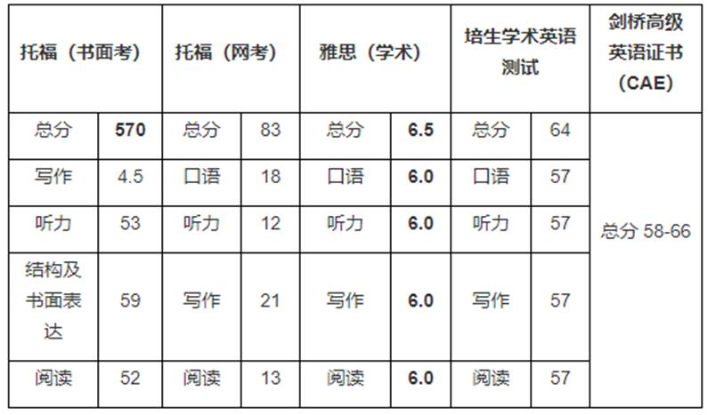英语水平要求雅思总分6.5分及以上,各部分不低于6.0分,或参照表中的其它英语水平考试最低分数要求。