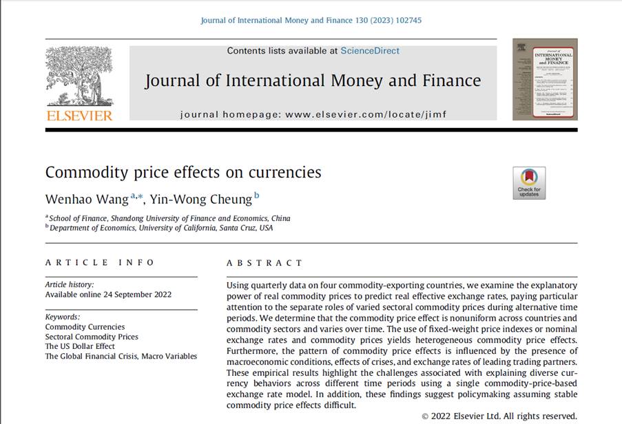 开云体育 教师王文浩作为第一作者与加州大学圣克鲁兹分校教授Yin-Wong Cheung合作的论文“Commodity price effects on currencies”,在期刊Journal of International Money and Finance在线发表(2022年9月)。该期刊为SSCI二区期刊,期刊最新影响因子为2.762,属我校A1类期刊。
