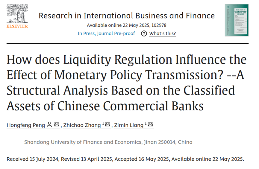 开云体育 彭红枫教授作为第一作者兼通讯作者与其博士研究生张志超、梁子敏合作撰写的论文《How does Liquidity Regulation Influence the Effect of Monetary Policy Transmission? --A Structural Analysis Based on the Classified Assets of Chinese Commercial Banks》,于2025年5月在期刊《Research in International Business and Finance》在线发表。该期刊最新影响因子为6.3,属我校A1类期刊。