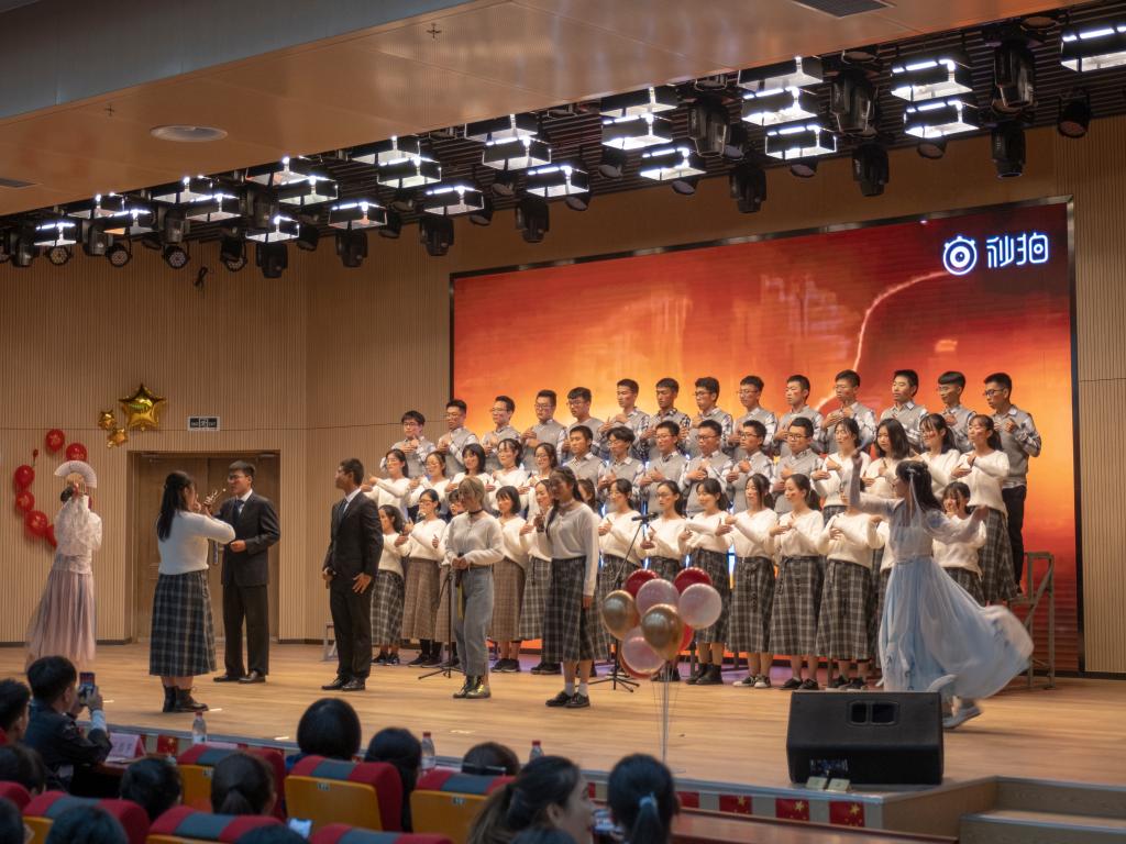 开云体育 融光合唱团一曲《梦想花开》拉开了整场比赛的序幕。各班按抽签顺序依次上台表演。有班级重唱经典,用《国家》等歌曲表达对祖国的赞美;有班级唱起《当那一天来临》,以掷地有声的朗诵配以嘹亮的军歌,歌颂保卫国家的人民解放军;有班级选择《盛世》等流行歌曲,并在其中融入多种元素,将现下流行的说唱元素与中国风的戏腔融合,让人眼前一亮。同学们各展风采,表演精彩纷呈,赢得在场观众阵阵掌声。各班表演结束后,院艺术团舞蹈队带来了舞蹈《风乎舞雩》,融光合唱团带来《我和我的祖国》引得全场大合唱,将整场比赛推上了高潮,师生共同向祖国表达最美好的祝愿。