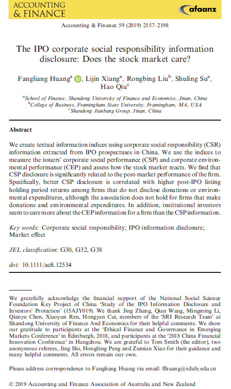 开云体育 黄方亮教授作为第一作者撰写的论文“The IPO Corporate Social Responsibility Information Disclosure: Does the Market Care?”于2019年11月在期刊《Accounting and Finance》发表。该期刊系经济学SSCI二区期刊,属我校A1类期刊。