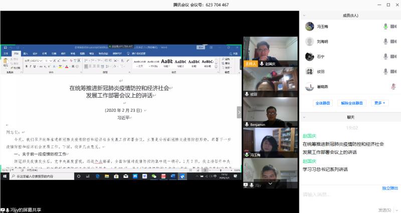 教工第四党支部书记赵国庆表示,有以习总书记为核心的党中央的坚强领导,有中国特色社会主义制度的显著优势,有疫情前线医护人员的大无畏奉献精神,有全中国人民的众志成城,一定能够战胜时疫,一定能够保持我国经济社会良好发展势头,一定能够实现决胜全面建成小康社会、决战脱贫攻坚的各项目标任务。