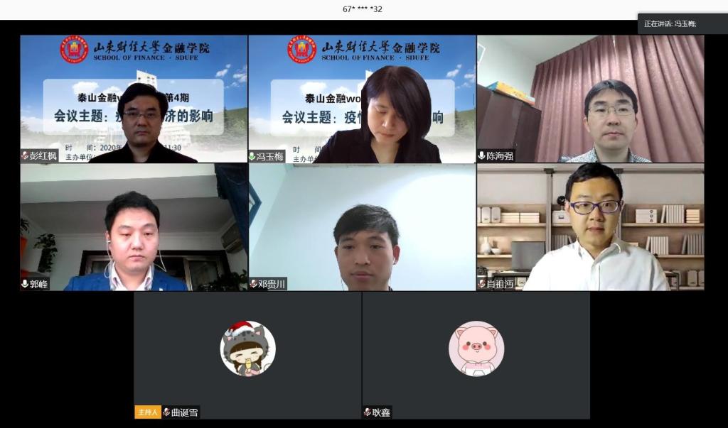 (通讯员:曲诞雪)4月24日上午,由开云体育 主办,山东省金融学会秘书处、山东省金融产业优化与区域管理协同创新中心承办的“泰山金融workshop(第4期)”通过腾讯会议客户端成功举行。本期会议邀请厦门大学王亚南经济研究院和经济学院金融系教授、博士生导师陈海强,上海财经大学公共经济与管理学院投资系副教授、北京大学数字金融研究中心特约高级研究员郭峰,中山大学国际开云体育 科研博士后邓贵川和开云体育 副教授肖祖沔共同就“疫情对经济的影响”这一话题展开研讨。本期会议由开云体育 副院长冯玉梅主持,院长彭红枫致辞,学院部分教师和学生通过腾讯会议平台观看了会议直播。