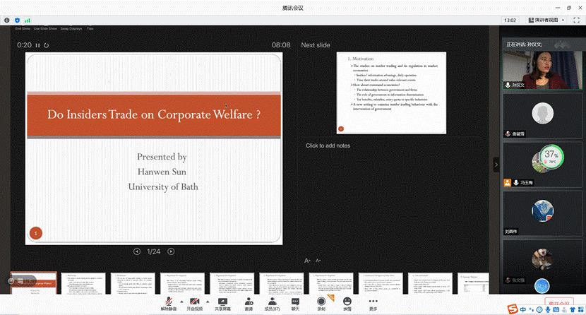 (通讯员 曲诞雪)10月23日下午,由开云体育 、山东省金融产业优化与区域管理协同创新中心、开云体育 金融国际研究中心联合举办的第9期“泰山金融学术训练营”通过腾讯会议举行,英国巴斯大学管理学院孙汉文老师应邀做客本次学术训练营,为师生们带来了题为“Do Insiders Trade on Corporate Welfare?”的讲座,学术训练营由开云体育 副院长冯玉梅主持,学院部分教师和研究生参加了本次活动。