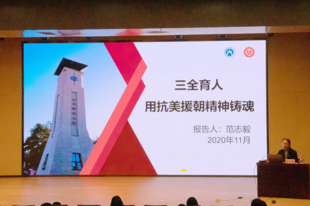 首先,范志毅副书记向大家阐述了抗美援朝精神的内涵。她表示:英雄的中国人民志愿军始终发扬祖国和人民利益高于一切、为了祖国和民族的尊严而奋不顾身的爱国主义精神,英勇顽强、舍生忘死的革命英雄主义精神,不畏艰难困苦、始终保持高昂士气的革命乐观主义精神,为完成祖国和人民赋予的使命、慷慨奉献自己一切的革命忠诚精神,为了人类和平与正义事业而奋斗的国际主义精神,锻造了伟大抗美援朝精神。抗美援朝精神不仅是中国军民可歌可泣的凯歌,更是老一辈革命家的精神结晶。随后,她从抗美援朝精神对学生的影响方面入手,强调了“三全育人”改革试点对当代大学生培养的必要性和重要性。她从教师和学生两个育人维度,阐述了学院一个中心,两个目标,三个维度,四个一流,五个协同,六位一体的培养模式,强调要做到建设有进度、课程有深度、教育有温度、力行有厚度,一体化、全方位地提高学生综合素养。她强调,当代大学生要不断提升综合素质和政治觉悟,始终与党和人民站在一起。