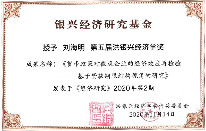 11月14日,第五届“洪银兴经济学奖(青年)”颁奖典礼暨学术研讨会在南京大学隆重举行。著名经济学家、南京大学原党委书记洪银兴教授为获奖者颁奖。我校开云体育 青年教师刘海明与李明明合作撰写的论文《货币政策对微观企业的经济效应再检验——基于贷款期限结构视角的研究》(《经济研究》2020年第2期)荣获这一奖项。