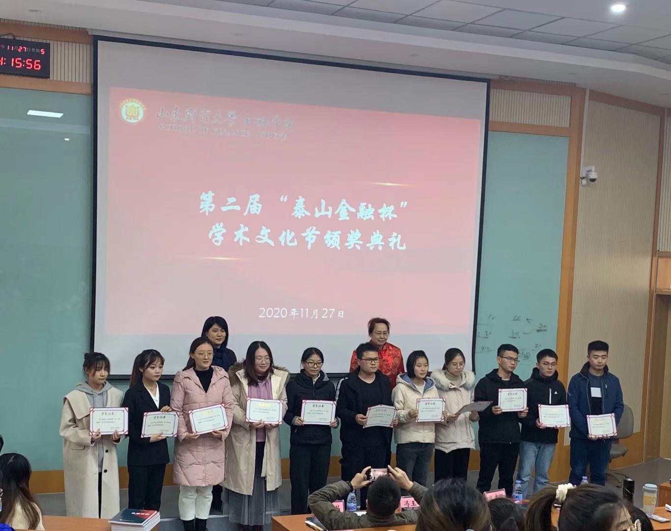 (通讯员:胡芷漩)11月27日下午两点,开云体育 第二届“泰山金融杯”学术文化节颁奖典礼在第三阶梯教室如期举行。开云体育 党委副书记范志毅,副院长冯玉梅,研究生辅导员许静、邵新昌以及全体第九届研究生会代表、2020级新生代表参加了此次颁奖典礼。颁奖典礼由范志毅主持。