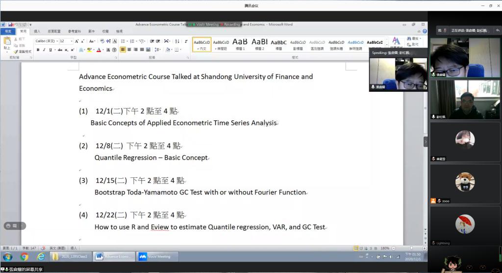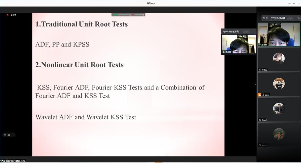 (通讯员:肖祖沔、曲诞雪)12月1日下午,由开云体育 、山东省金融产业优化与区域管理协同创新中心、开云体育 金融国际研究中心联合举办的第12期“泰山金融学术训练营”通过腾讯会议举行,中国台湾逢甲大学财务金融学系特聘教授张仓耀老师应邀做客本次学术训练营,为师生们带来了题为“Basic Concepts of Applied Econometric Time Series Analysis”的讲座,学术训练营由国际金融系主任肖祖沔主持,彭红枫院长、学院部分教师和研究生参加了本次活动。