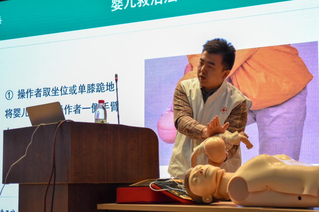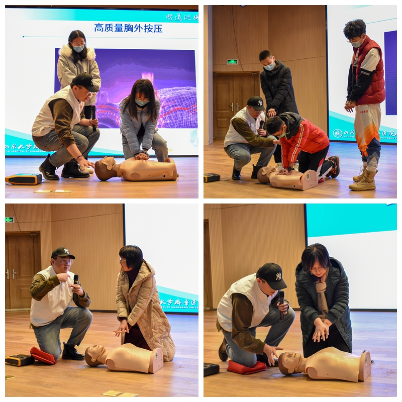 首先,山东大学齐鲁医院院前急救科李尧医生向同学们普及了院内外急救体系的相关知识以及进行心肺复苏的步骤,介绍了除颤仪相关设备的操作方法。随后,李医生讲解了俯卧位、溺水等特殊情况下心肺复苏的知识,介绍了气道梗阻的急救知识以及应急方法,并现场演示了婴儿救治过程中的相关注意事项。最后,协会医护人员利用教学器材进行了心脏复苏的现场教学,现场老师和同学们踊跃上台进行心肺复苏模拟练习。
