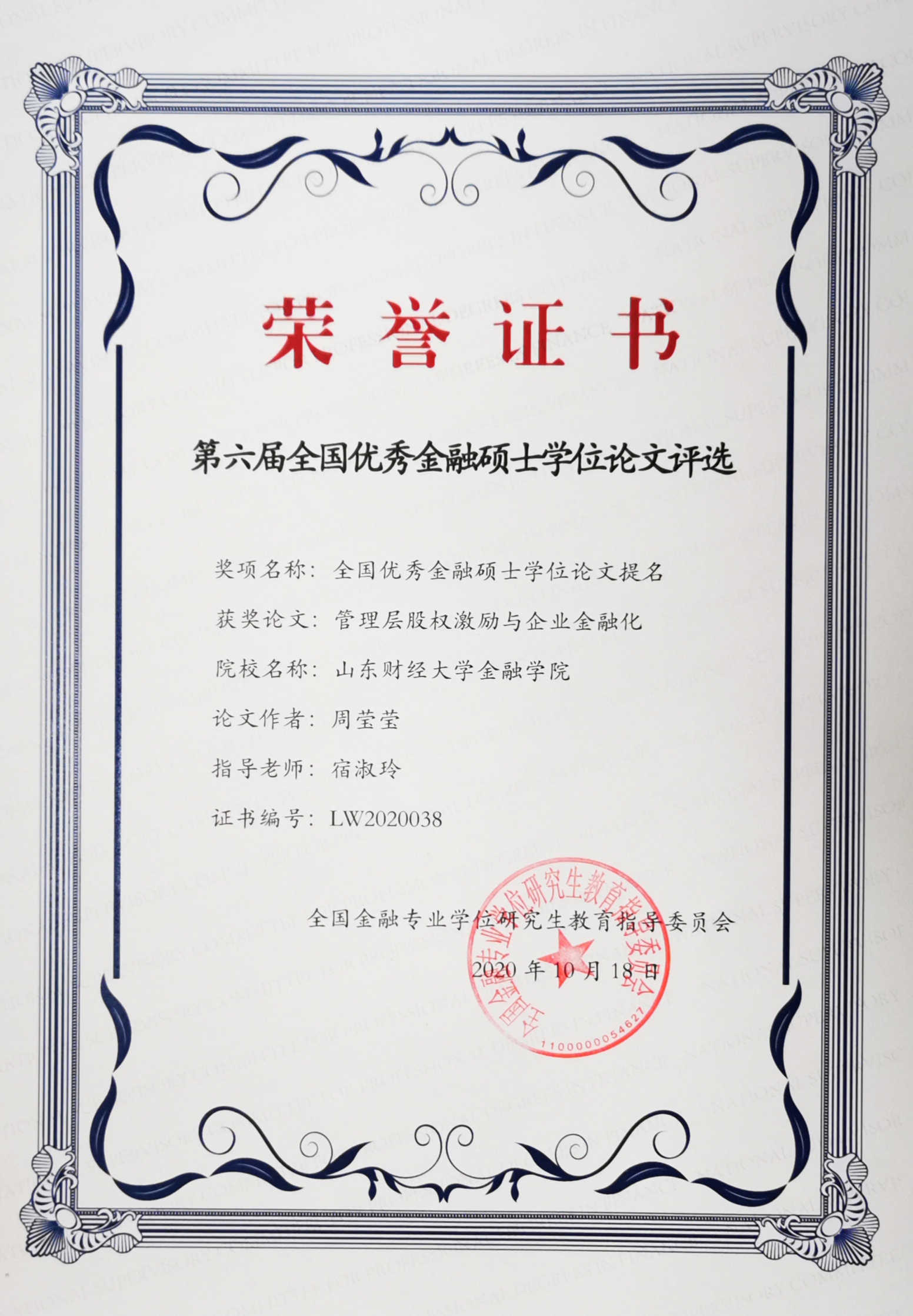 (通讯员 李梦)近日,我院宿淑玲老师指导的周莹莹同学金融硕士学位论文《管理层股权激励与企业金融化》荣获第六届全国优秀金融硕士学位论文提名奖。