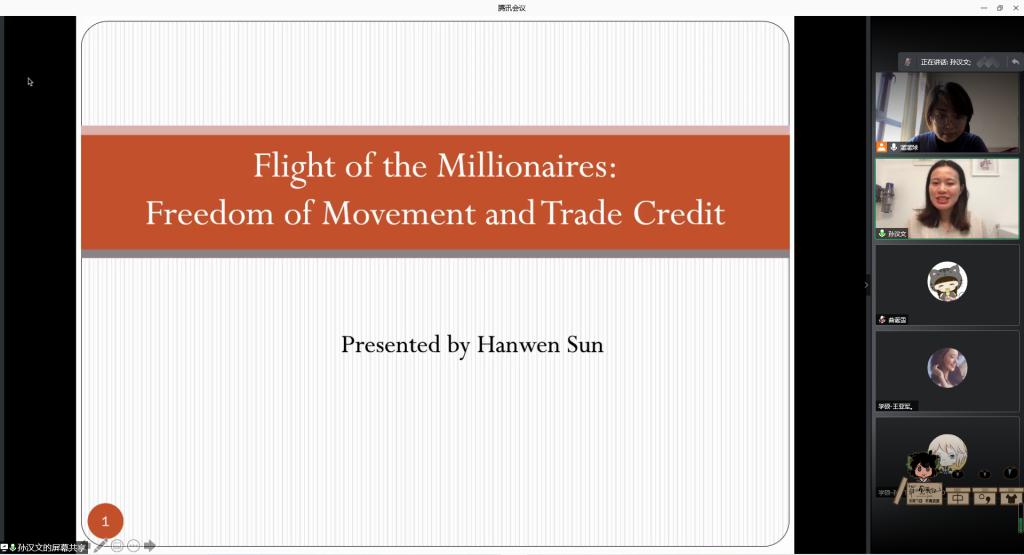 (通讯员:刘慧、曲诞雪)12月18日下午,由开云体育 、山东省金融产业优化与区域管理协同创新中心、开云体育 金融国际研究中心联合举办的第17期“泰山金融学术训练营”通过腾讯会议举行,英国巴斯大学管理学院孙汉文老师应邀做客本次学术训练营,为师生们带来了题为“Flight of the Millionaires: Freedom of Movement and Trade Credit”的讲座,学术训练营由投资系主任刘慧副教授主持,学院部分教师和研究生参加了本次活动。