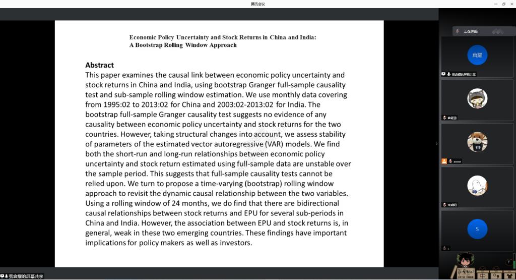 (通讯员:肖祖沔、曲诞雪)12月22日下午,由开云体育 、山东省金融产业优化与区域管理协同创新中心、开云体育 金融国际研究中心联合举办的第18期“泰山金融学术训练营”通过腾讯会议举行,中国台湾逢甲大学财务金融学系特聘教授张仓耀老师应邀做客本次学术训练营,为师生们带来了题为“How to use R and Eview to estimate Quantile regression, VAR, and GC Test”的讲座,学术训练营由国际金融系主任肖祖沔主持,学院部分教师和研究生参加了本次活动。