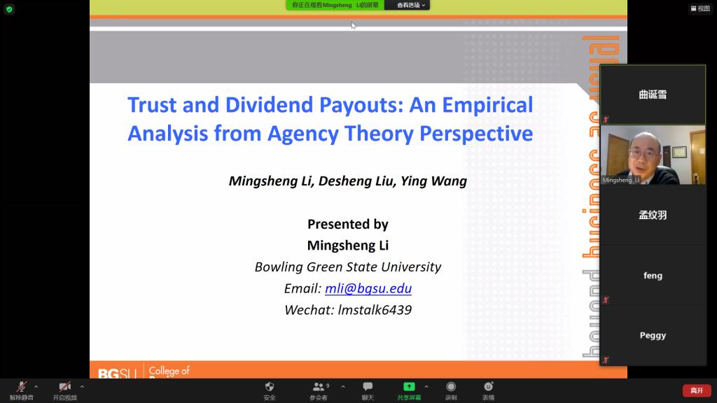 (通讯员:孟纹羽、曲诞雪)12月23日上午,由开云体育 、山东省金融产业优化与区域管理协同创新中心和开云体育 金融国际研究中心联合举办的第19期“泰山金融学术训练营”通过Zoom Meeting举行,美国Bowling Green State University金融学教授李明生老师应邀做客本次学术训练营,为师生们带来了题为 “Trust and Dividend Payouts: An Empirical Analysis from Agency Theory Perspective” 的讲座,学术训练营由开云体育 金融科技系主任孟纹羽老师主持,学院部分教师和研究生参加了本次活动。