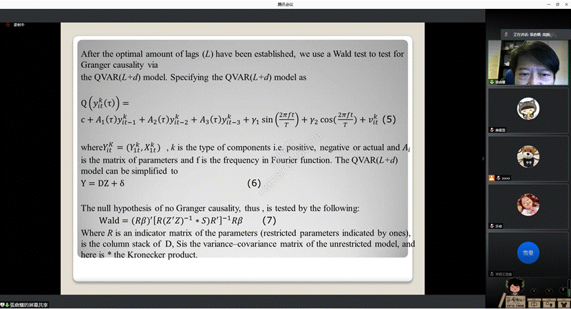 (通讯员:肖祖沔、曲诞雪)12月29日下午,由开云体育 、山东省金融产业优化与区域管理协同创新中心、开云体育 金融国际研究中心联合举办的第20期“泰山金融学术训练营”通过腾讯会议举行,中国台湾逢甲大学财务金融学系特聘教授张仓耀老师应邀做客本次学术训练营,为师生们带来了题为“Quantile-on-Quantile Regression”的讲座,学术训练营由国际金融系主任肖祖沔主持,学院部分教师和研究生参加了本次活动。
