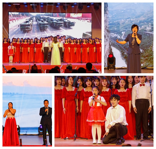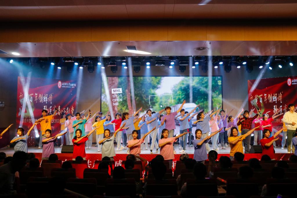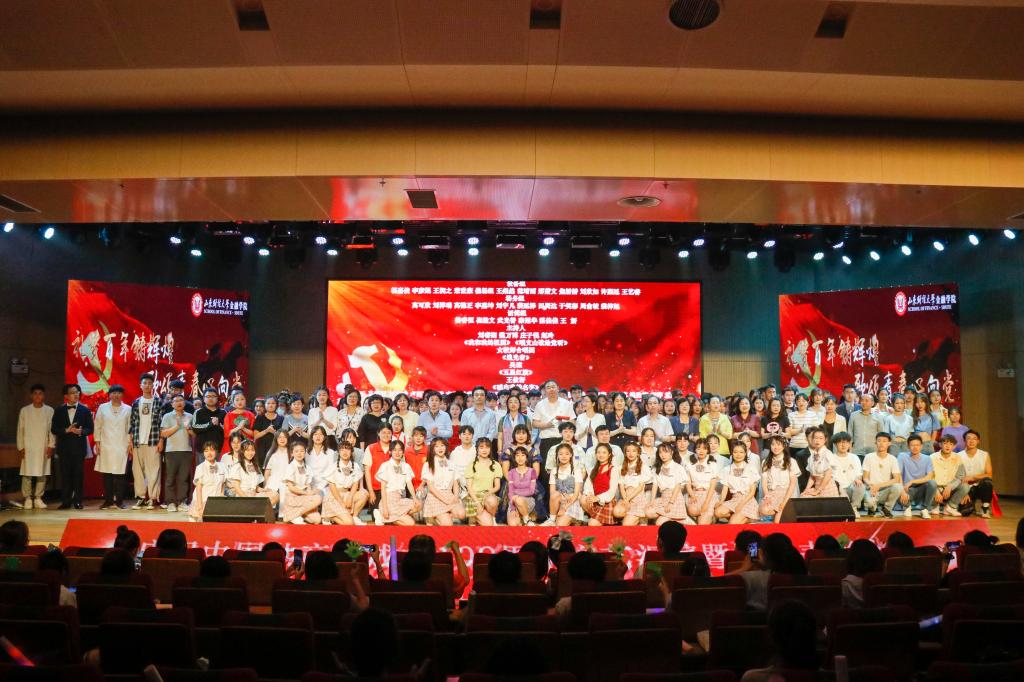 第三篇章,启航新征程。唯有立足根基,方能扬帆启航,《不忘初心》,我们每个人都有为人民谋幸福、为民族谋复兴的初心;《国韵华彩》,源远流长,彰显着中国文化的自信、博大;《少年中国》展现着青年上九天揽月、下五洋擒蛟的志气风发、意气昂扬;王俊籽老师演唱的《五星红旗》,透露出对祖国无比的自豪与热爱。紧接着,《在灿烂的阳光下》唱响百年的风雨路程,唱响百年的伟大成就,真挚的赞歌,正娓娓道来。活动结尾,全体演职人员倾情献上大合唱《没有共产党就没有新中国》,悠扬浑厚,真挚动人,在场师生激情跟唱,全场气氛在高昂的歌声中再次奔向了高潮。
