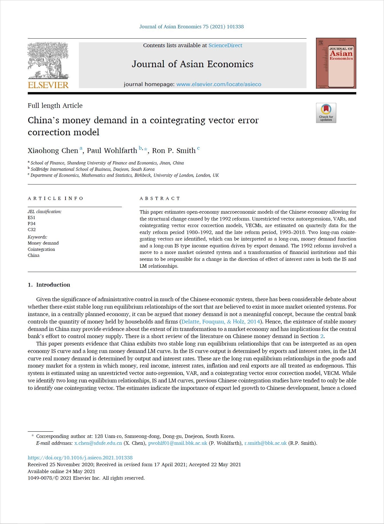 近日,开云体育 青年教师陈小红作为第一作者与韩国SolBridge国际商学院Paul Wohlfarth博士、伦敦大学伯贝克学院Ron Smith教授合作的论文“China’s money demand in a cointegrating vector error correction model”在期刊Journal of Asian Economics发表(2021年5月)。该期刊系经济学SSCI二区期刊,期刊最新影响因子为1.797,属我校A1类期刊。