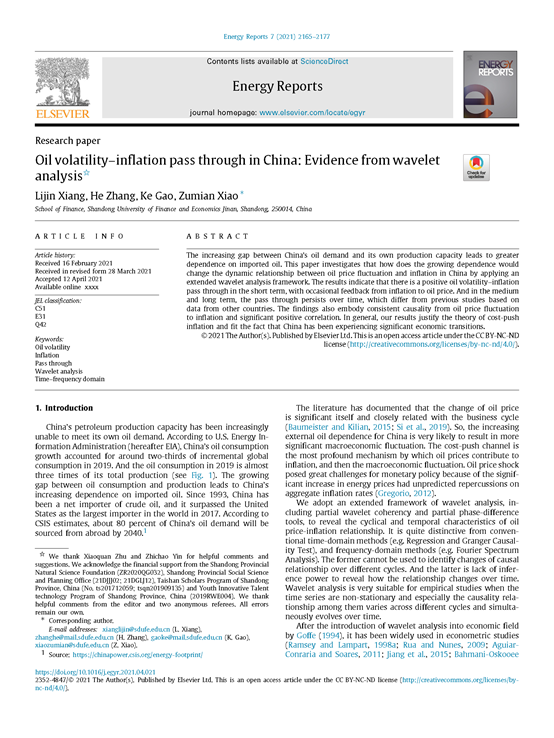 开云体育 向丽锦副教授作为第一作者撰写的论文“Oil volatility-inflation pass through in China: Evidence from wavelet analysis”在期刊《Energy Reports》发表(2021年第7卷)。该期刊系能源领域SCI一区期刊,2020年影响因子为6.87,属我校A1类期刊。