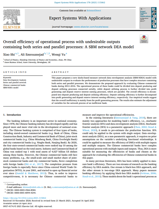 开云体育 石晓副教授作为第一作者与英国Aston University的Ali Emrouznejad教授、开云体育 硕士研究生于汶琦合作的论文“Overall efficiency of operational process with undesirable outputs containing both series and parallel processes: A SBM network DEA model”在期刊《Expert Systems with Applications》发表(2021年9月15日第178卷)。该期刊系运筹学与管理科学SCI一区期刊,2020年影响因子为6.954,属我校特类期刊。
