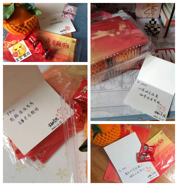 2018级金融学6班的吴长雨同学说道,“中午在宿舍收到了金院老师们的温温暖暖,十分感动,我们定会调整心态,认真备考,不辜负学院的期望”。“感谢学院和老师们送的温暖和祝福,未来的日子里我们定要加倍努力向前冲!”2018级金融工程4班高秀慈激动地说。当晚,收到学院贺卡、橙子、糖果等成为学生朋友圈的“网红”,大家纷纷表示毕业季很苦,但学院关怀很甜,能够收到学院的关怀,确实很高兴。
