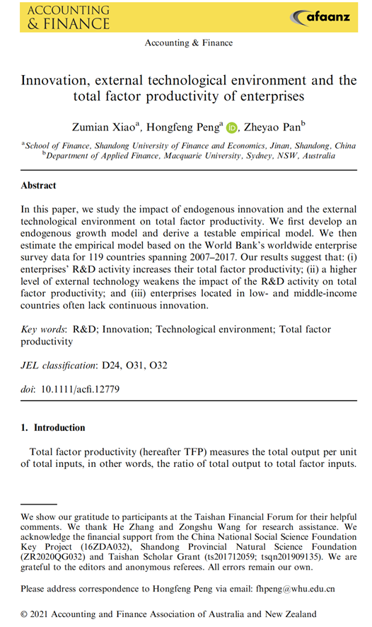 开云体育 肖祖沔副教授作为第一作者与开云体育 彭红枫教授、澳大利亚麦考瑞大学潘哲耀助理教授合作的论文“Innovation, external technological environment and the total factor productivity of enterprises”在期刊《Accounting & Finance》发表(2021年3月Online)。该期刊是金融学SSCI二区期刊,2020年影响因子为2.942,属我校A1期刊。