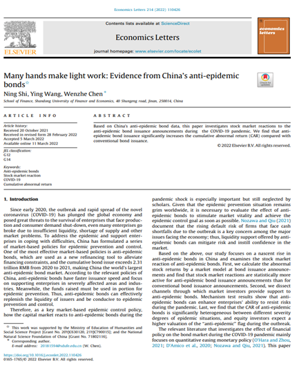 开云体育 石宁讲师(第一作者)与王营副教授和陈文哲副教授(通讯作者)合作撰写的论文《Many hands make light work:Evidence from China’s anti-epidemic bonds》在《Economics Letters》2022年第214卷发表。该期刊属于我校A1期刊。