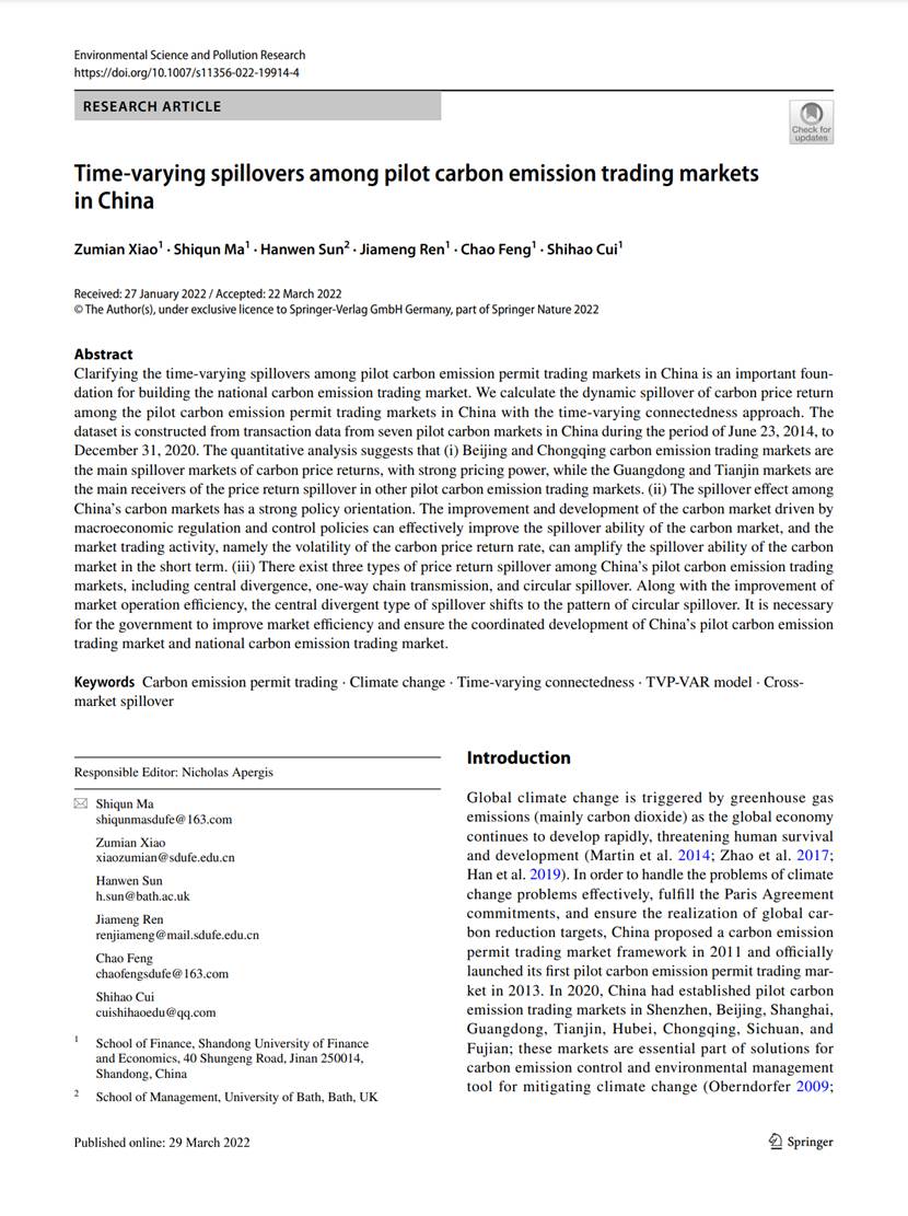 开云体育 肖祖沔副教授作为第一作者在期刊《Environmental Science and Pollution Research》发表论文“Time‑varying spillovers among pilot carbon emission trading markets in China”(2022年第3期)。该期刊系JCR二区SCI期刊,影响因子为4.223,属我校A2类期刊。合作者包括英国巴斯大学助理教授孙汉文;开云体育 硕士研究生马世群、封超及本科生任佳萌、崔世豪。