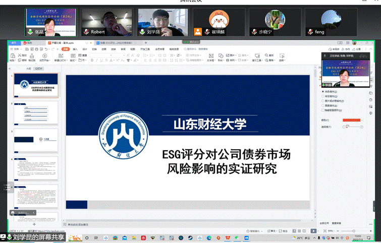 接下来,刘学昆同学汇报了论文《An Empirical Study on the Impact of ESG Scores on the Market Risk of Corporate Bond》,该文基于面板模型,利用我国A股上市公司2012-2019年的相关数据,从投资者角度就ESG评分对公司债券市场风险进行了实证研究。Robert教授在异质性分析过程的严谨性与参考文献的代表性方面提出了相关建议,黄方亮教授对中介机制的逻辑性问题提出质疑,其他两位老师也对中介机制方面进行了讨论,并提出了相关建议。