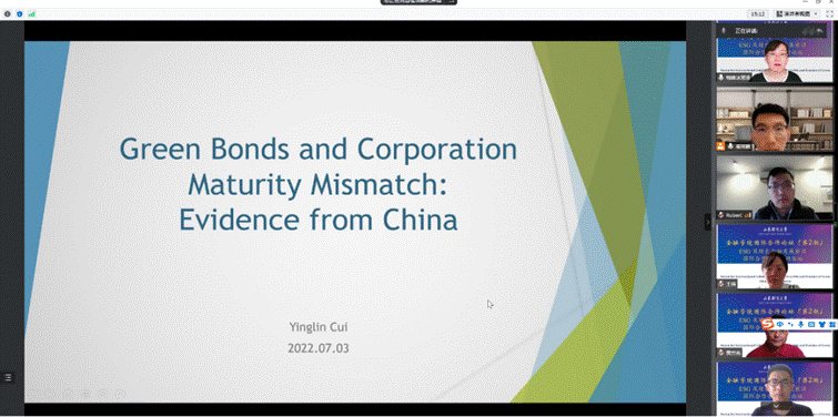 随后,靳英丹同学汇报了论文《Can Green Bonds Mitigate the Impact of Liquidity Risk on the Yield Spread?——Empirical Evidence from China’s Corporate Bond Market》。该文基于2016-2021年中国上市公司发行的债券数据,通过面板模型证实绿色债券市场较之普通债券,进一步加剧了流动性风险对信用利差的影响程度,并通过将信用利差分解得到违约价差,进一步证实绿色债券市场的流动性风险对债券违约价差存在传导效应。Robert教授就模型构建方面进行了指导,黄方亮教授则在倾向得分匹配方法的合理性角度等方面提出了相关建议,其他老师认为需要进一步考虑内生性问题。