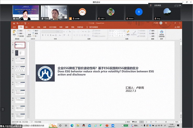 最后,卢新雨同学汇报了论文《Does ESG behavior reduce stock price volatility? Distinction between ESG action and disclosure》,该论文采用固定效应回归对2011年至2020年沪深A股上市公司ESG履行情况对股价波动性的影响进行探究,论文区分企业所做出的ESG承诺和实际行动,考察企业是否做到言行一致。Robert教授对ESG言行指标提出了更有说服力的衡量方法,王倩副教授建议进一步划分样本组进行更为深入的探究,其他老师则在被解释变量的相关性和合理性等方面给出了建议。