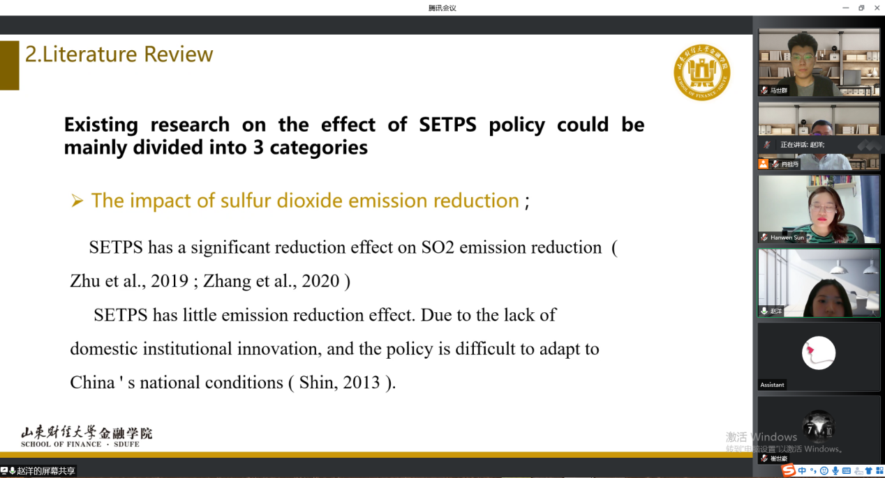 最后,赵洋汇报了论文《The Green Bonus: Carbon Reduction Effect of Sulfur Dioxide Emissions Trading Pilot Scheme》,该文将二氧化硫排放交易试点计划(SETPS)作为准自然实验,采用PSM-DID方法对SETPS对企业碳排放的减排效应进行深入探究。得出SETPS能够有效促进企业的碳减排;SETPS对高能耗、高污染企业的碳减排效果更为显著;SETPS通过市场化进程和非国有经济发展对碳排放的间接减排效应;融资约束和所有权都是SETPS影响企业碳减排的调节因素等研究结论。孙汉文副教授指出该文应阐明安慰剂检验的原因,此外,机制分析中,应对中介变量的选择提供相应理论支撑。