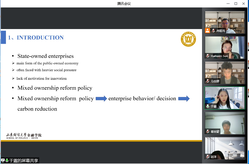 其次,于露汇报了论文《Greener Together: The Impact of China's Mixed-ownership Reform on Firm Carbon Emissions》,该文使用了倾向得分匹配(PSM)方法和双重差分(DID)法研究了国有企业混合所有制改革对二氧化碳排放的影响。文中还从能源结构、能源消费强度和污染防治能力三个方面分析了国有企业混合所有制改革对企业碳排放的作用机理。结果表明,中国国有企业混合所有制改革对减少碳排放具有重要作用,并且中国混合所有制改革显著降低了东部和中部地区的碳排放。孙汉文副教授在文章研究样本实验组与对照组的选择与设定方面给出了建设性意见。