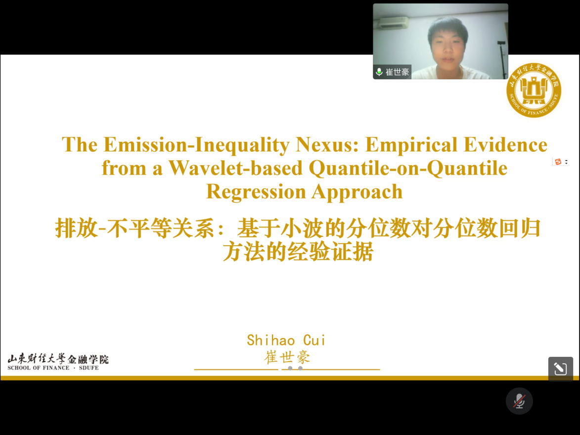 随后,崔世豪汇报了论文《The Emission-Inequality Nexus: Empirical Evidence from a Wavelet-based Quantile-on-Quantile Regression Approach》,该文利用小波分解(Wavelet Decomposition)与分位数对分位数回归(Quantile-on-Quantile regression)方法对1915年至2019年美国和法国的碳排放与国内收入不平等的非线性关系进行研究,这也是第一篇利用QQR方法研究收入不平等与二氧化碳排放之间作用关系的文章。孙汉文副教授在样本国的选取合理性以及研究结论的代表性方面提出了相关建议,此外,孙汉文副教授仍指出本文应就QQR方法的选取原因以及该方法的优势进行进一步详细说明。