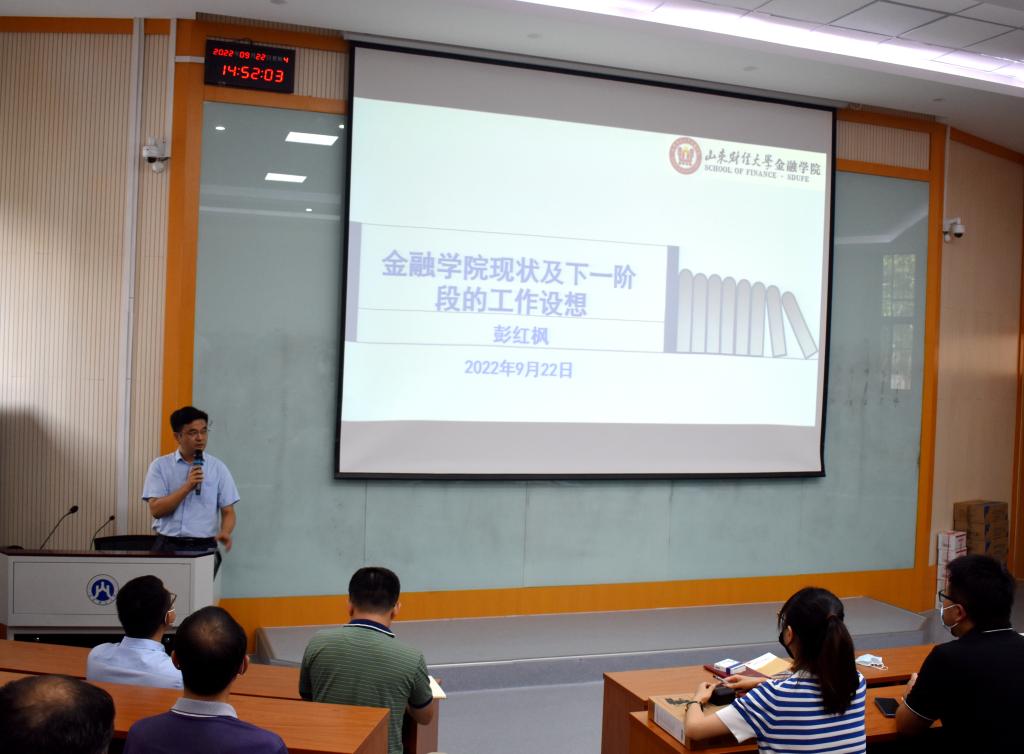 彭红枫院长总结了过去四年学院取得的成绩。他强调,经过学院师生的共同努力,学科建设水平在省内已取得领先地位,在国内同学科中也具有重要影响,学院多个专业和课程为国家一流水平及山东省一流水平,金融工程、金融学和投资学在国内高校中名列前茅,新建设专业金融科技也位于国内前10。近几年呈现高层次人才称号分散化的趋势,人才引进也保持在高水平的态势中。高水平论文的发表占比过半,位于省内同学科领先水平,国家“两金”项目和教育项目立项数量也多年位于学校领先地位。人才培养方面,学生保研率和考研率逐年提高,学生到国内一流高校深造常态化,在“挑战杯”等社会实践大赛中取得国家级奖项常态化,赴青海等边远地区支教常态化。社会服务水平不断提高,有多篇研究报告获得党和国家领导人批示和中央部委采用并上报有关领导同志审阅,与多家金融机构和企业开展合作项目研发。在总结取得成绩的同时,彭红枫院长也指出了学院目前发展的六个方面的瓶颈以及亟待解决的问题,这些问题需要新一届学院班子团结奋斗、集思广益,以高度的事业心和使命感带领学院广大师生继续按照学院既定的发展理念,努力前行,未来争取在学院标志性成果的取得方面、学生人才培养质量方面、国家级、省部级人才培养方面、学科声誉、社会声誉及同行认可度方面、服务山东、服务社会方面、宣传学院方面等取得更大的成绩和突破。鼓励学院老师们再接再厉、力争上游,努力让学院在教学科研等各个方面更上一层楼。