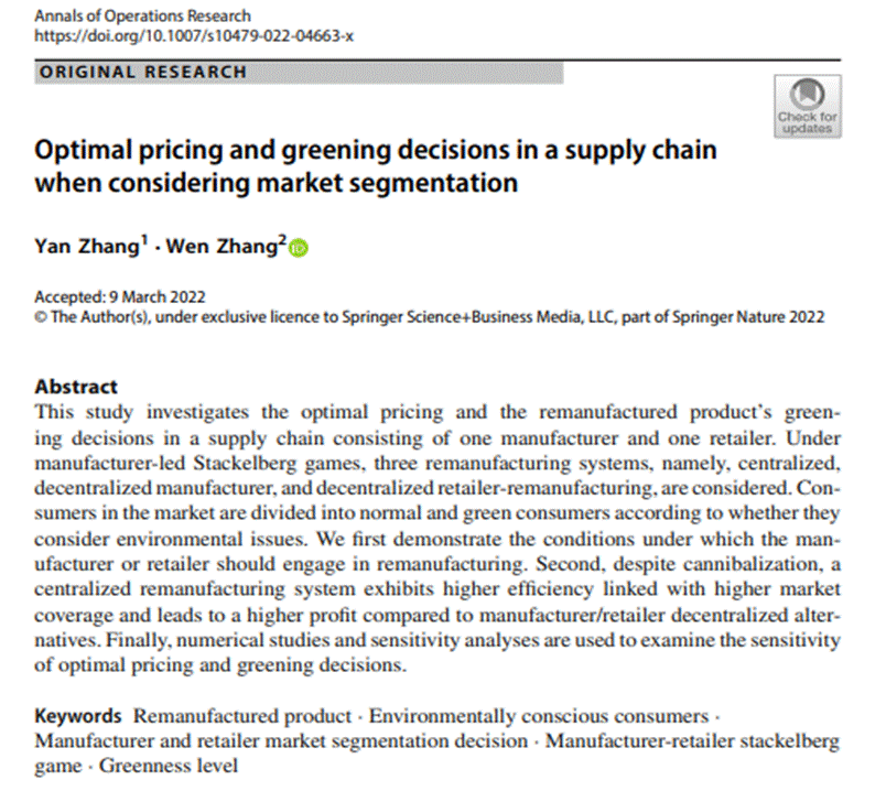 开云体育 教师张艳作为第一作者发表的论文,“Optimal pricing and greening decisions in a supply chain when considering market segmentation”,在期刊 Annals of Operations Research 在线发表(2022年3月)。该期刊系运筹学与管理科学SCI三区期刊,最新影响因子为6.1,属我校A2类期刊。