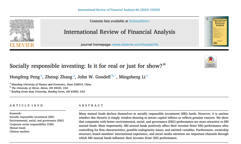 开云体育 彭红枫教授作为第一作者与硕士生张榛岂、美国阿克伦大学John W. Goodell教授、美国鲍林格林州立大学李明生教授合作的论文“Socially responsible investing: Is it for real or just for show?”在期刊International Review of Financial Analysis正式发表(2023年1月)。该期刊为SSCI一区期刊,期刊最新影响因子为8.235,属我校A1类期刊。