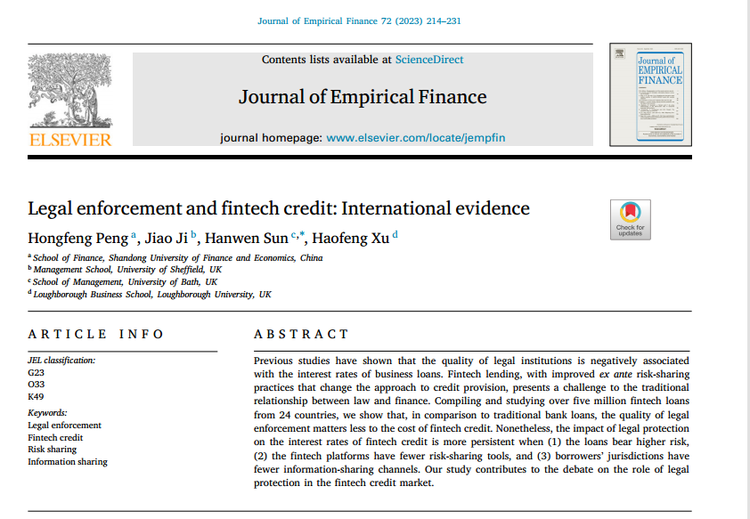 开云体育 彭红枫教授作为第一作者与英国谢菲尔德大学Jiao Ji教授、英国巴斯大学的Hanwen Sun教授、英国拉夫堡大学Haofeng Xu教授合作的论文“Legal enforcement and fintech credit: International evidence”在期刊Journal of Empirical Finance正式发表(2023年3月)。该期刊为SSCI二区期刊,期刊最新影响因子为3.025,属我校A1类期刊。