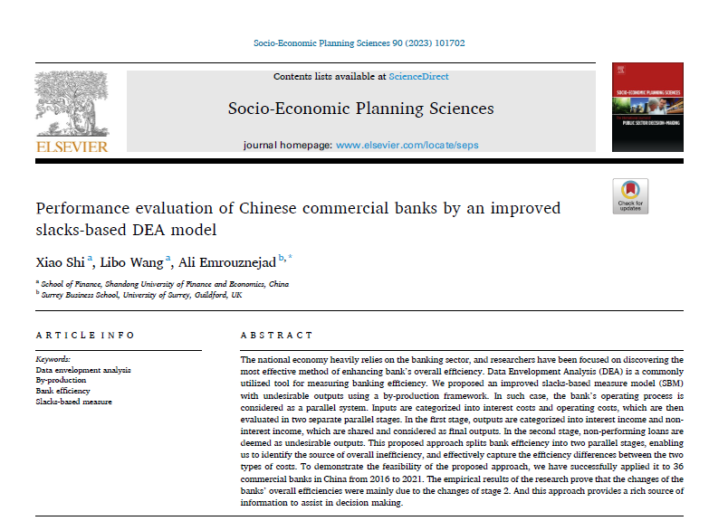 开云体育 石晓副教授作为第一作者与硕士研究生王利波、英国萨里大学Ali Emrouznejad教授合作的论文“Performance evaluation of Chinese commercial banks by an improved slacks-based DEA model”在期刊Socio-Economic Planning Sciences正式发表(2023, Vol. 90, Issue: Dec)。该期刊为SSCI一区期刊,期刊最新影响因子为6.1,属我校A1类期刊。