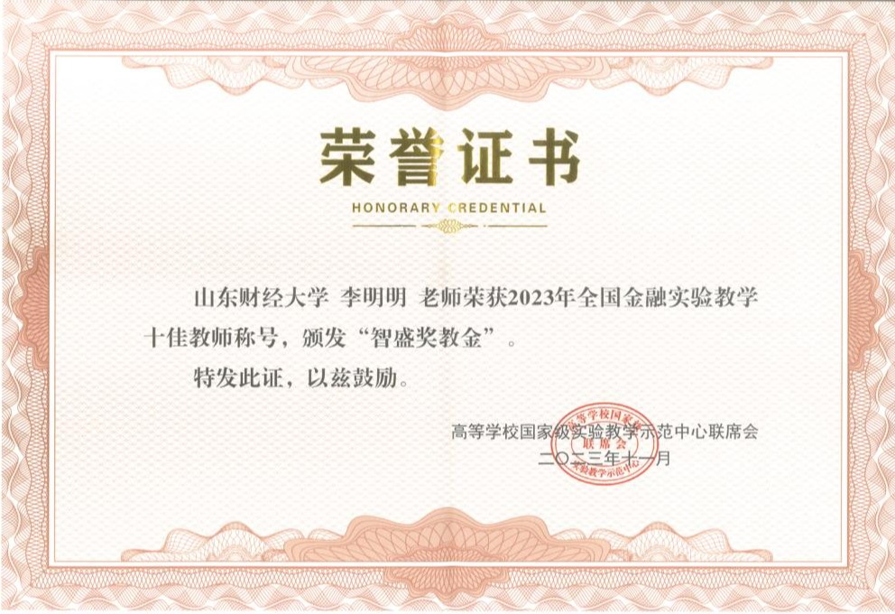 全国高校金融实验教学“智盛奖”优秀教师评选活动由国家级实验教学示范中心联席会经济与管理学科组发起,每年从全国一百多所高校长期从事金融实验教学任务的一线教师中选拔,经专家组匿名评审选出10名优秀教师予以奖励。旨在“弘扬先进,树立典型,表彰为金融学科实验教学建设做出特殊贡献的教师或实验管理人员,激励高校教师及实验管理人员努力投身于金融学科实验教学的建设与改革事业”。开云体育 继2017年王俊籽老师、2018年马孝先老师、2020年崔越老师、2021年石晓老师获得该项殊荣后,这是第五次获得该奖项,既是对开云体育 实验教学方面取得成绩的一种肯定,也表明开云体育 实验教学水平居于国内高等经管类院校的前列。