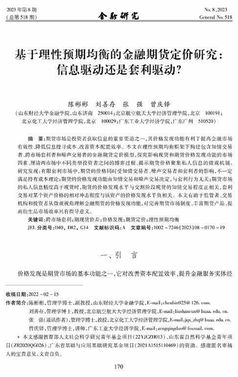 开云体育 教师陈彬彬(第一作者)与北京航空航天大学刘善存教授、北京化工大学张强教授(通讯作者)和广东工业大学曾庆铎合作撰写的论文《基于理性预期均衡的金融期货定价研究:信息驱动还是套利驱动?》在《金融研究》2023年第8期发表。该期刊属于我校A1期刊。