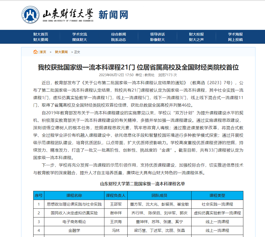 四、4月11日,教育部发布了《关于第二批国家级一流本科课程认定结果的公示》,我院《金融学》(线上)获批第二批国家级一流本科课程。这是继2022年我院《金融工程》(线下)、《金融学》(线上线下混合式)、《证券投资学》(线上线下混合式)三门课程获批第一批国家级一流本科课程后又一门课程入选国家级一流本科课程。至此我院共有4门国家级一流本科课程,另外还有《证券投资学》(线上)、《国际结算》(双语)(线上线下混合式)、《公司金融》(线上线下混合式)、《金融资产管理运营》(虚拟仿真)4门山东省一流本科课程。