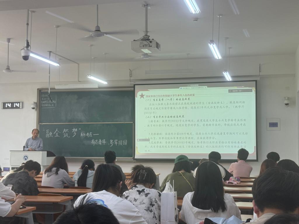 为全面贯彻习近平总书记关于军事建设和青年发展的重要思想,为同学们普及参军入伍的相关知识,鼓励同学们响应国家号召积极参军入伍并传承和弘扬爱国主义精神,开云体育 举办了“融金筑梦”系列讲座——以青年之志,献身国防事业。本次讲座由开云体育 学工办主任、转业军人李勇主讲,学院圣井校区学生参加。