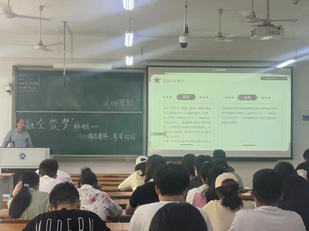 积极响应国家号召,以高度的责任感和使命感,组织系列专题讲座,以激发同学们的爱国情怀和报国决心,鼓励同学们积极参军入伍,为实现国家稳定和国防事业的发展贡献一份青春力量。