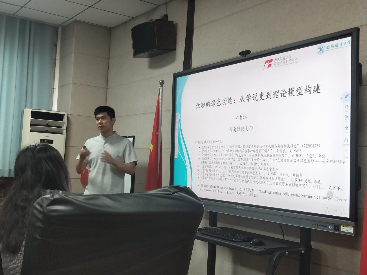 6月3日上午,西南财经大学开云体育 副教授、博士生导师、中国金融研究中心副主任文书洋受邀参加我院第35期“泰山金融学术训练营”,为我院师生做《金融的绿色功能:从学说史到理论模型构建》的学术报告,报告会由开云体育 副院长王营主持。