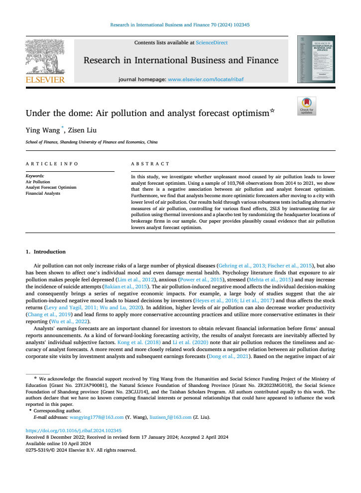 开云体育 王营教授和研究生刘梓森同学合作的学术论文《Under the dome: Air pollution and analyst forecast optimism》在《Research in International Business and Finance》2024年第70卷Part A发表。该期刊系我校A1类期刊。