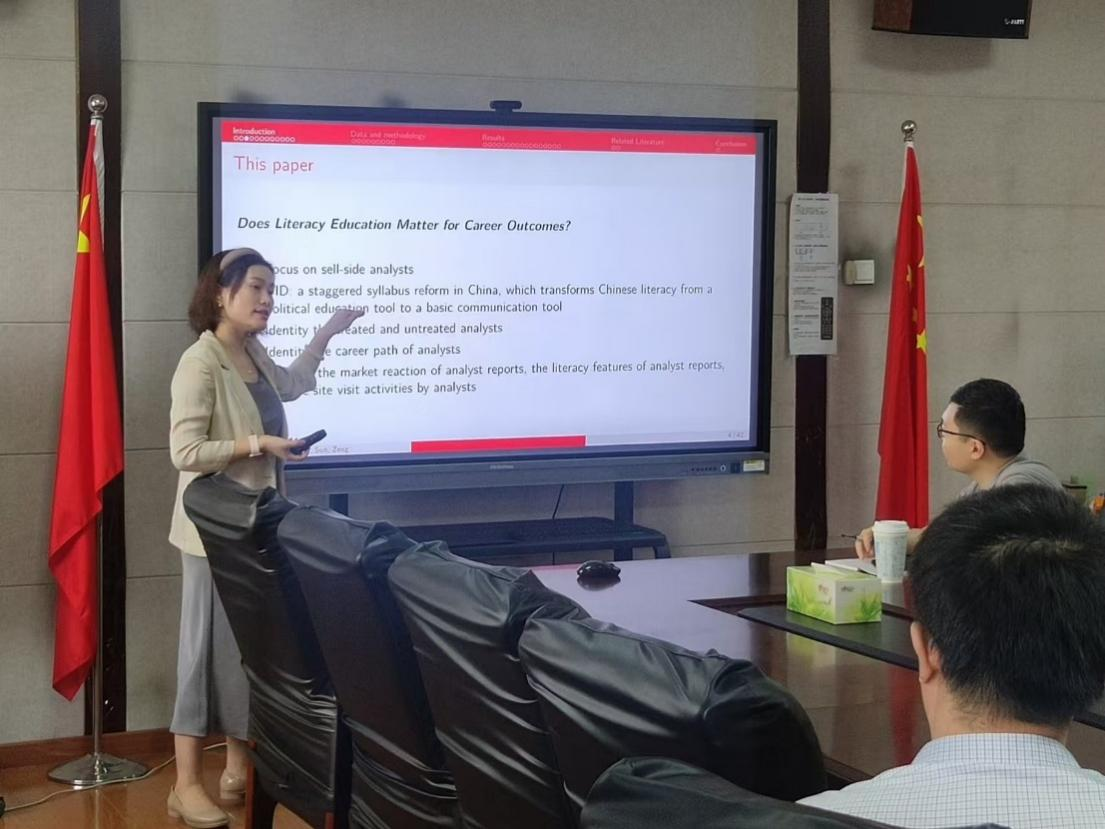 孙教授的该篇文章聚焦于卖方分析师这一职业群体,重点考察了中国1996年高中语文课程改革如何改变了语言与读写教育的内容和目标,从而塑造了分析师的沟通能力与职业发展路径。研究运用了差异化处理模型(DID),通过识别受改革影响的分析师群体,评估了该改革对分析师职业晋升、市场反应、调研活动及报告语言特征等方面的影响。文章的研究结果表明,接受过改革后语文教育的分析师相比未接受该教育的分析师在职业发展上展现出更快的晋升速度、更频繁的调研活动及市场对其报告的更强反应。论文宣讲结束后,孙教授与学院师生就相关问题展开了热烈的学术讨论。