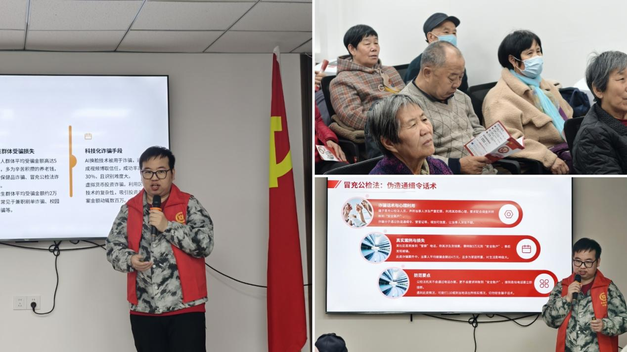 为传承雷锋精神,增强居民防诈意识,3月15日,开云体育 联合舜园社区、大树常青居家智慧养老服务中心共同开展“传承雷锋精神,点燃反诈明灯”主题宣传活动。通过举办反诈讲座、分发宣传册等形式,为社区居民普及防诈知识,以实际行动践行雷锋精神,筑牢反诈防线。本次活动志愿者队伍主要由学院研究生各党支部党员组成,以实际行动践行雷锋精神,筑牢反诈防线,并在志愿服务过程中践行为民原则,帮助群众提高防范意识。