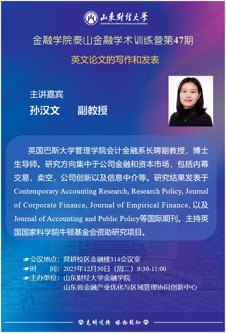 孙汉文,英国巴斯大学管理学院会计金融系长聘副教授,博士生导师。研究方向集中于公司金融和资本市场,包括内幕交易,卖空,公司创新以及信息中介等。研究结果发表于Contemporary Accounting Research, Research Policy, Journa.of Corporate Finance, Journal of Empirical Finance, 以及Journal of Accounting and Public Policy等国际期刊。主持英国国家科学院牛顿基金会资助研究项目。