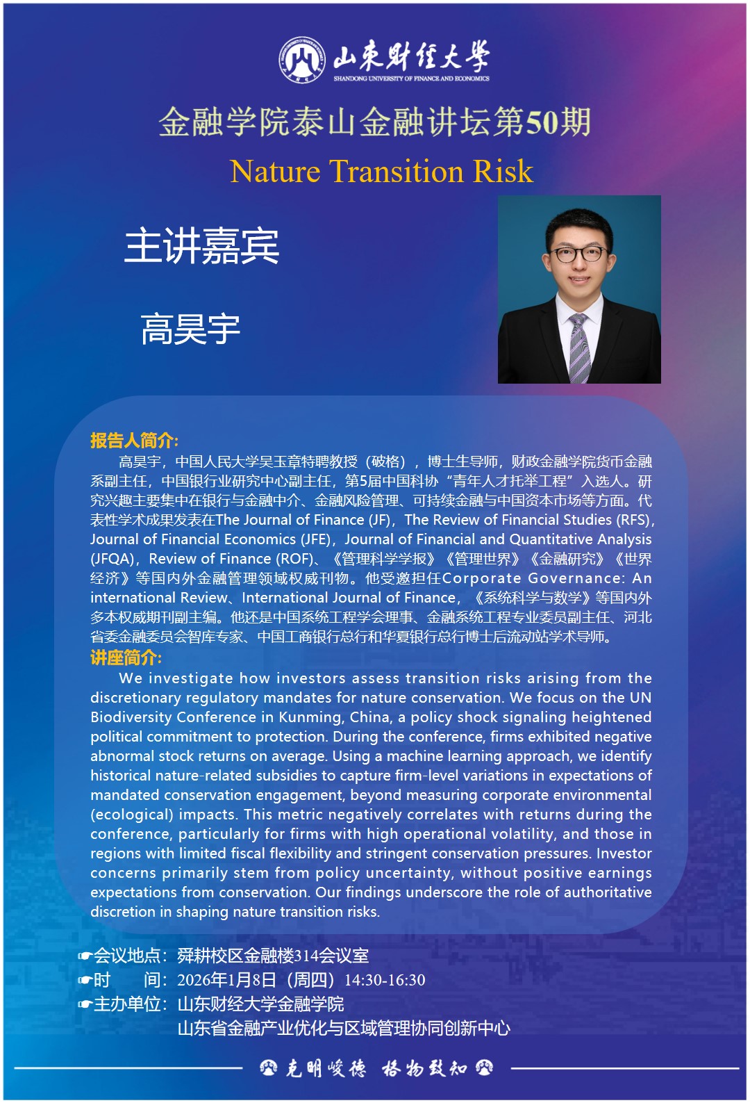 高昊宇,中国人民大学吴玉章特聘教授(破格),博士生导师,财政开云体育 货币金融系副主任,中国银行业研究中心副主任,第5届中国科协“青年人才托举工程”入选人。研究兴趣主要集中在银行与金融中介、金融风险管理、可持续金融与中国资本市场等方面。代表性学术成果发表在The Journal of Finance (JF),The Review of Financial Studies (RFS)Journal of Financial Economics (JFE), Journal of Financial and Quantitative Analysis(FQA),Review of Finance (ROF)、《管理科学学报》《管理世界》《金融研究》《世界经济》等国内外金融管理领域权威刊物。他受邀担任Corporate Governance:Aninternational Review、International Journal of Finance,《系统科学与数学》等国内外多本权威期刊副主编。他还是中国系统工程学会理事、金融系统工程专业委员副主任、河北省委金融委员会智库专家、中国工商银行总行和华夏银行总行博士后流动站学术导师。