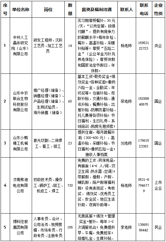届时,中材人工晶体研究院(山东)有限公司、山东中农联合生物科技股份有限公司、齐鲁技工学校、佳宝乳业、博科控股集团、山东小鸭精工机械等近70余家央国企、上市公司、民企现场招贤纳士。岗位涉及研发、总裁助理、人事专员、汽车制造、财务管理、教师等各类岗位1600多个,薪资及福利待遇优厚。