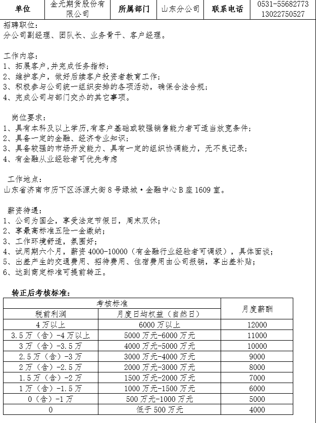 金元期货股份有限公司 山东分公司招聘计划